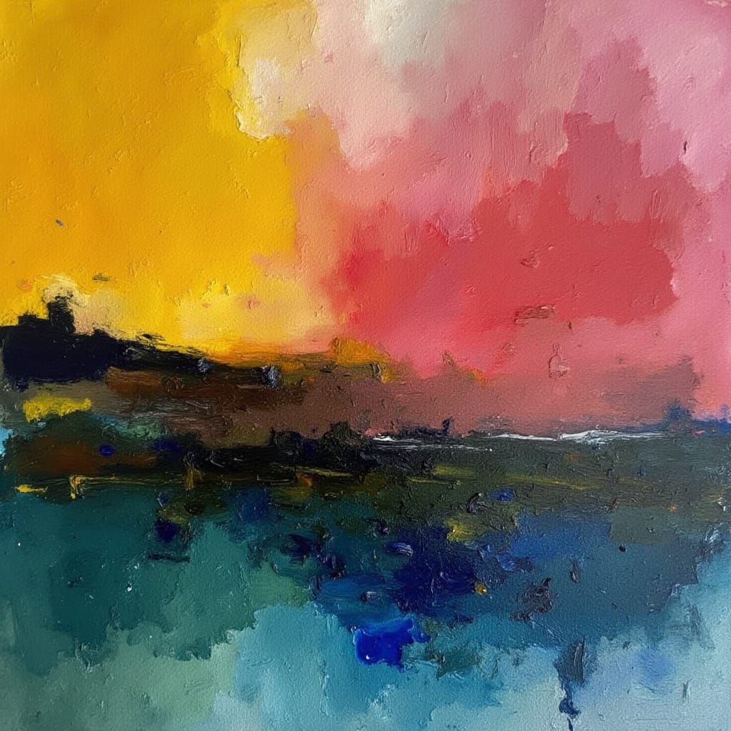 This abstract painting features a serene composition with expressive strokes and vivid hues, blending mixed media textures to evoke depth and dimensionality, reminiscent of abstract expressionist styles.