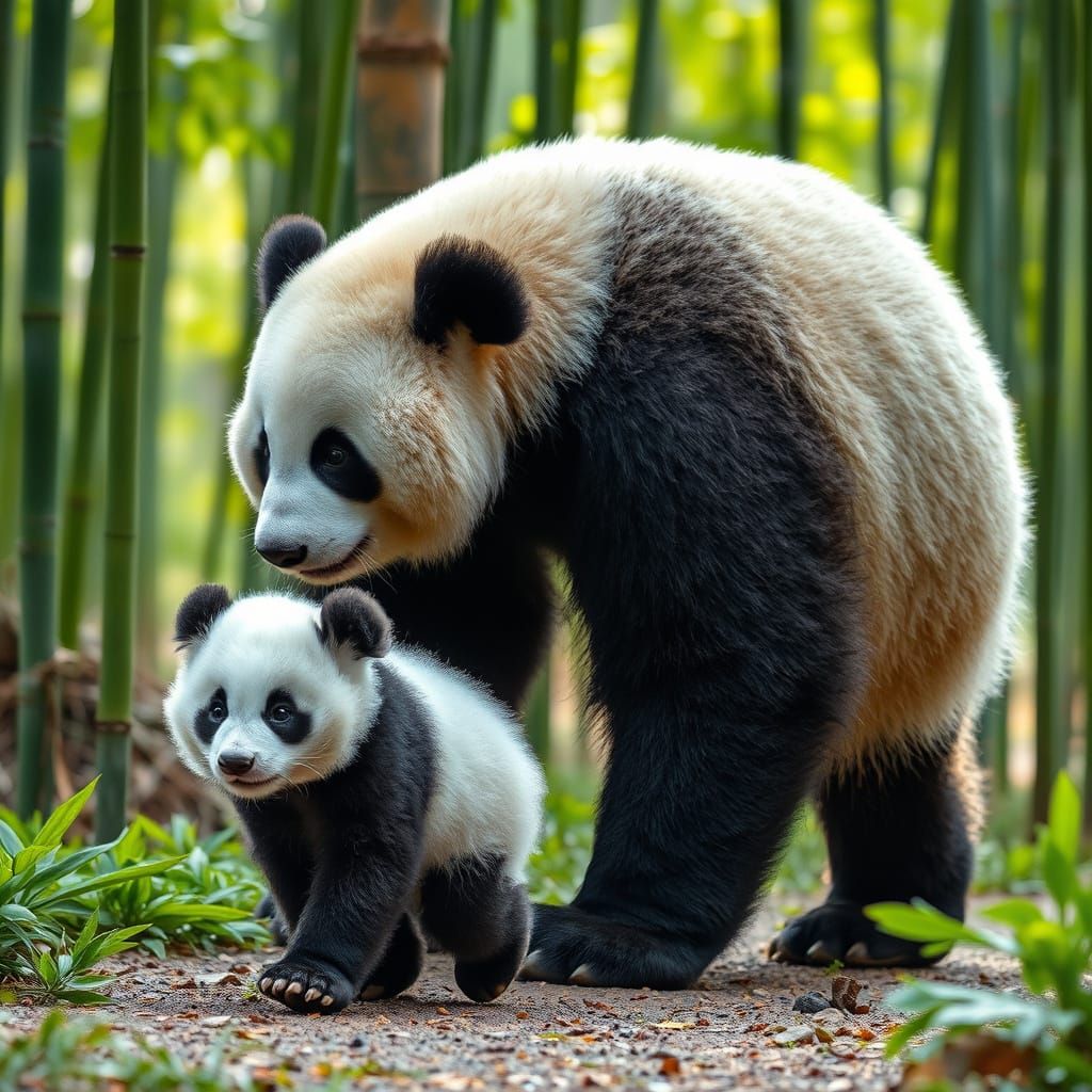 an realistic adorable baby panda walking happily on 4 legs beside his mom panda walking on 4 legs beside him the pandas are in a bamboo forest