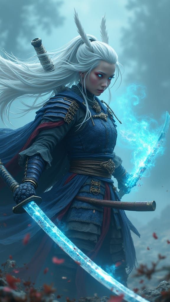 This striking anime-inspired image depicts a pale-skinned female oni samurai, exuding ferocity as she strides forward in intricately crafted, region-specific armor. Her long, dark hair flows behind her, and a glowing blue katana shines with ethereal light.