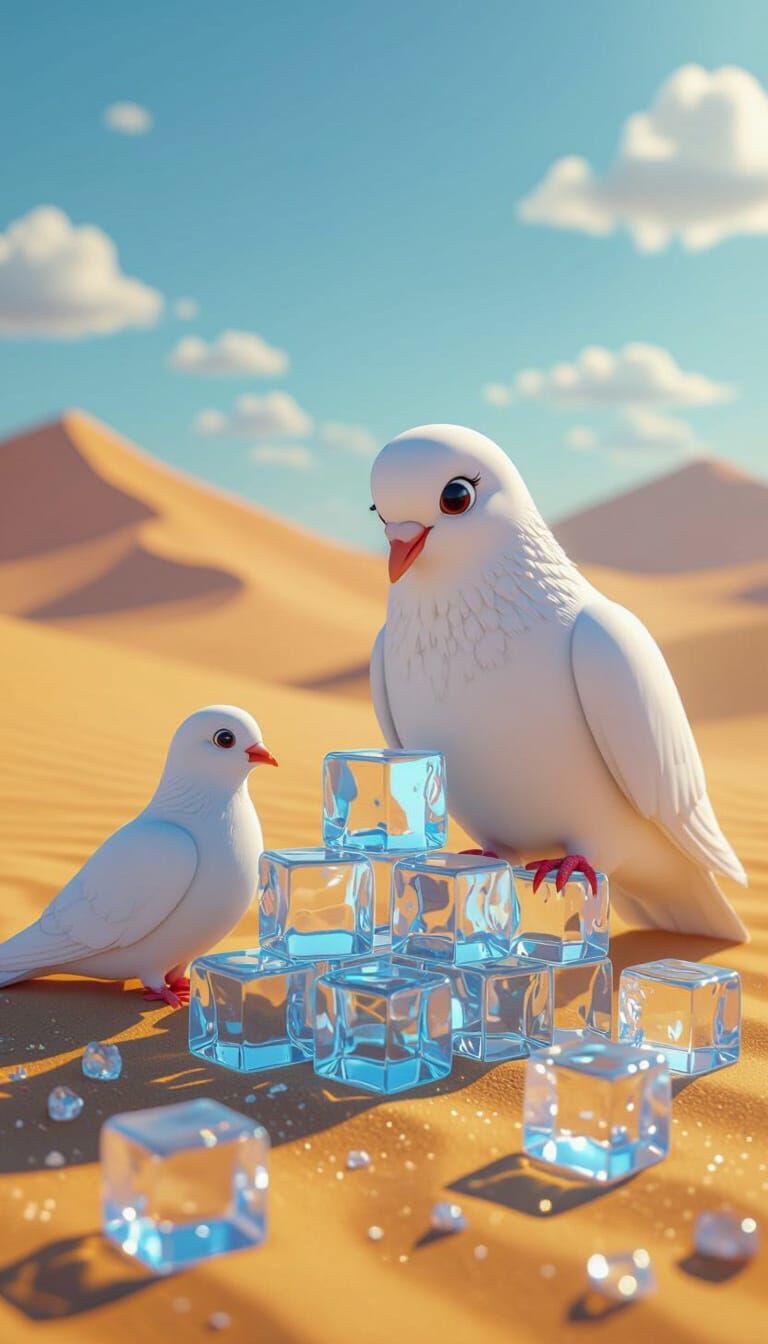 A realistic 3D cartoon depicts a mother and child pigeon stacking shining ice cubes to create a bed in a vibrant Indian desert. Sunlight casts blue reflections on the sand under a clear sky.