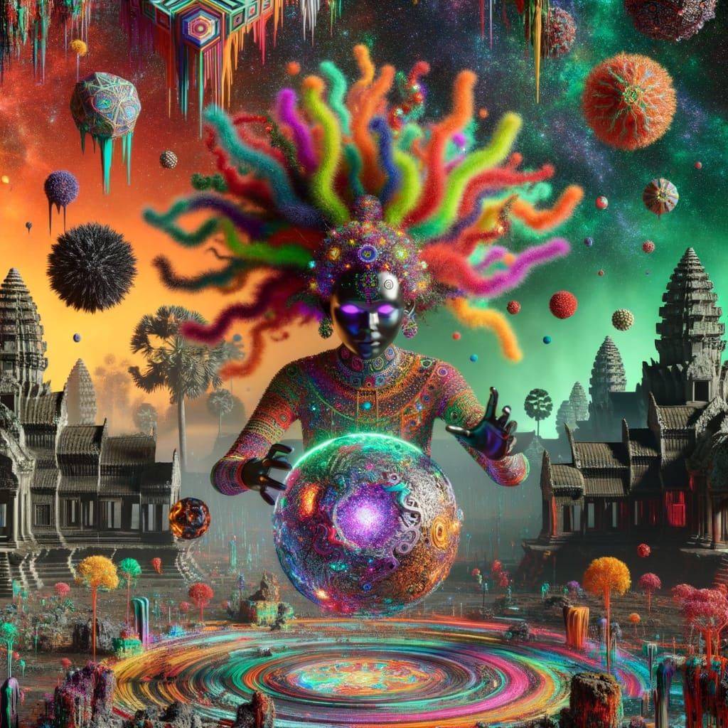 This image depicts a stunning, cinematic scene with a mystical alien fairy witch in a psychedelic Angkor Wat landscape. Dominated by vibrant colors, the scene features intricate mandala patterns and a glowing, otherworldly atmosphere.