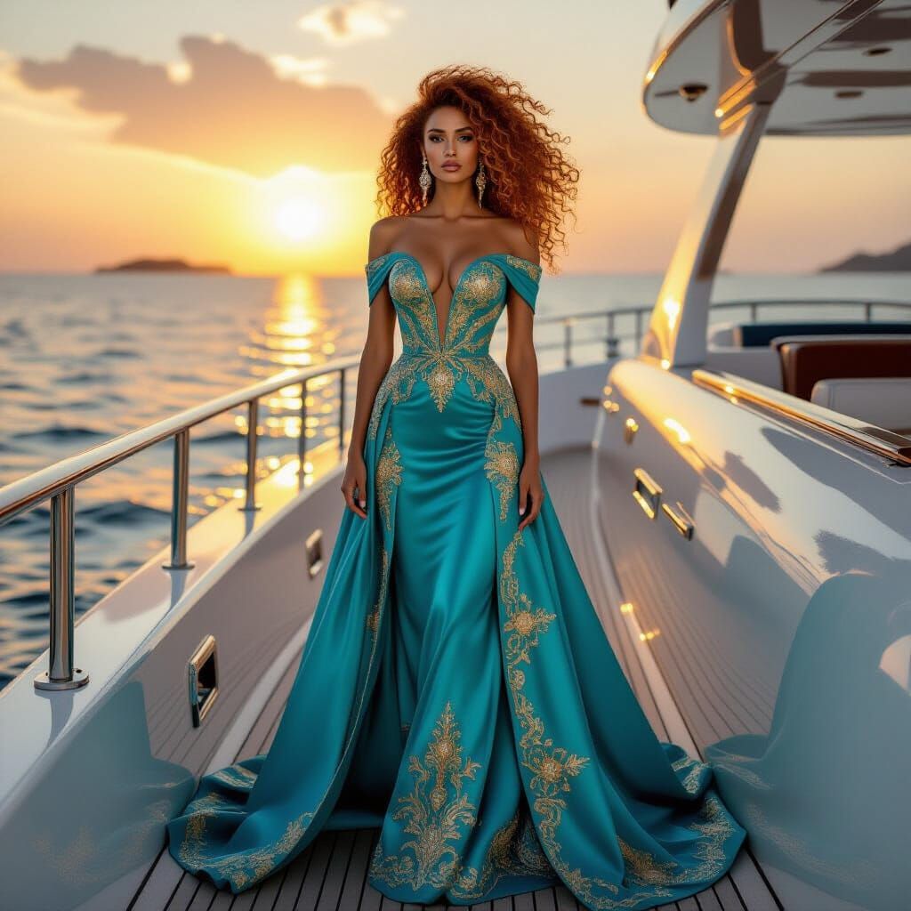 This image shows a beautiful woman with copper hair on a yacht during golden hour. She wears a blue haute couture gown with gold embroidery in a cinematic style. The image is photorealistic.