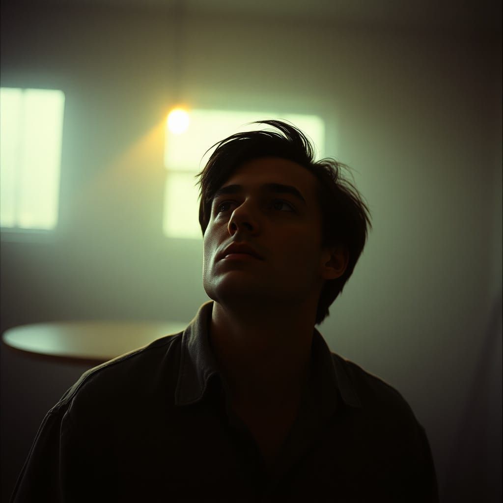 This image captures a poignant moment of introspection, bathed in warm, cinematic lighting reminiscent of classic 35mm film. A contemplative figure is lost in thought, surrounded by soft focus and expressive color grading.