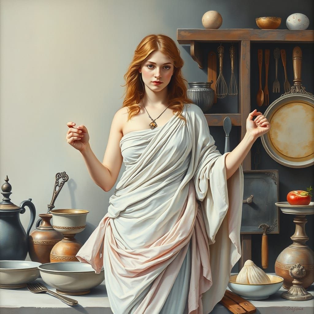 A surreal image of Aphrodite as a cook, surrounded by kitchenware. The artwork evokes a dreamlike quality with its soft pastel watercolors, monochrome tones and oil on canvas texture.