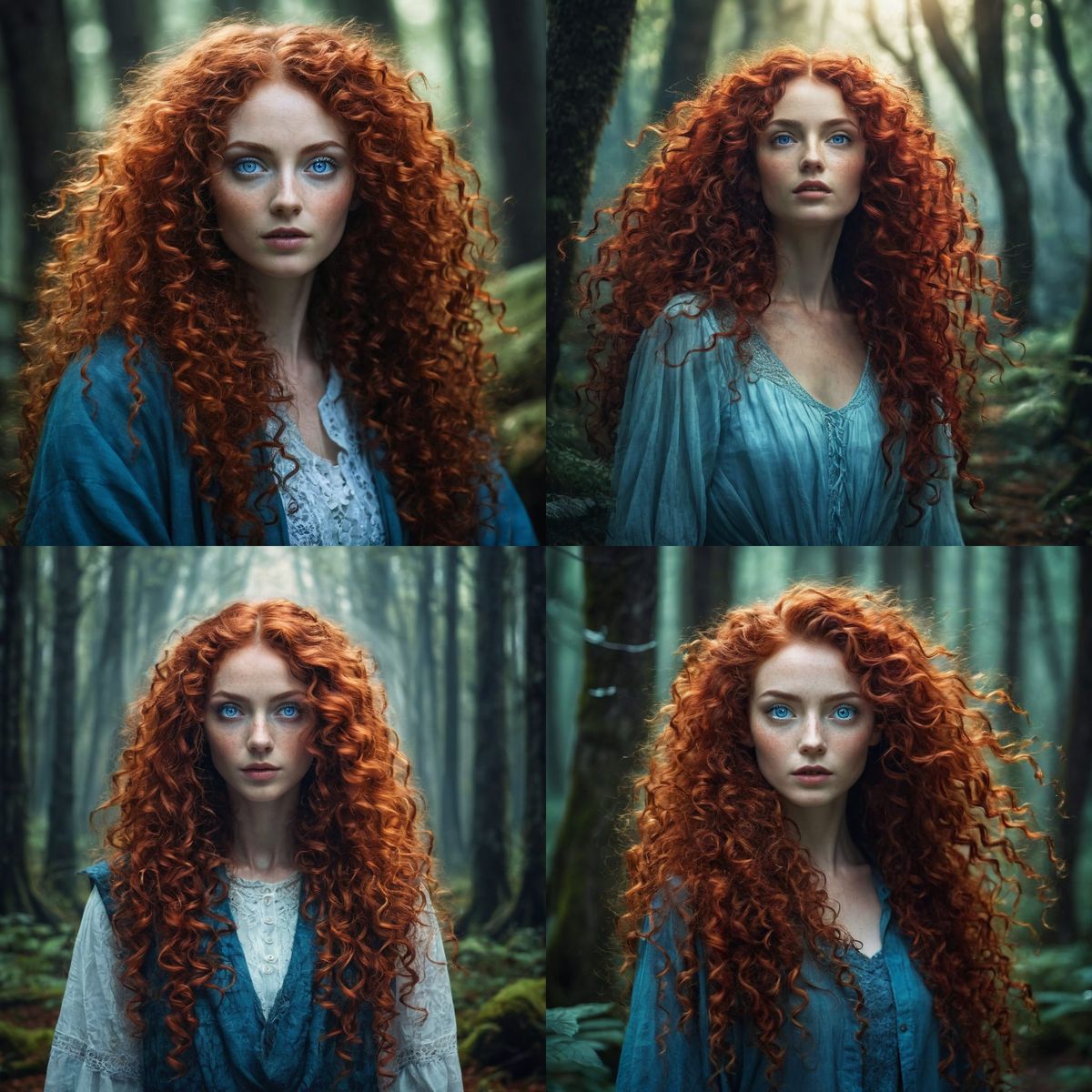 This image showcases a young woman with vibrant red curly hair and striking blue eyes, emanating magical energy in an enchanted forest setting.