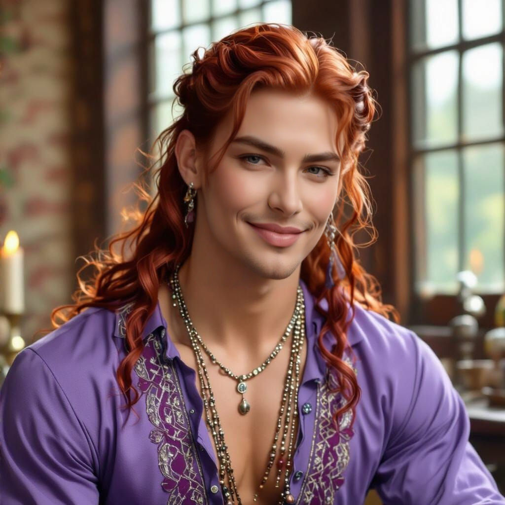 A hyper-realistic photograph of a smiling, androgynous young man with long red hair and green eyes. The man, who is dressed in Wiccan style, stands in a crystal-filled occult shop.