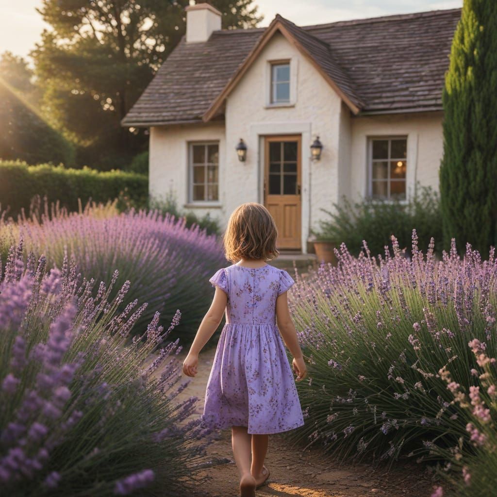 A sunlit cottage stands near a lavender field where a child plays. This image captures a whimsical scene with warm, golden lighting and soft brushstrokes, rendered in an impressionistic style.