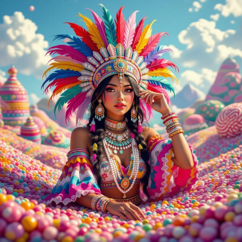 A vibrant digital illustration of an Aztec-Maya woman in traditional attire, set in a surreal Candyland. The image blends hyperrealism with cel-shaded textures, reminiscent of anime concept art.