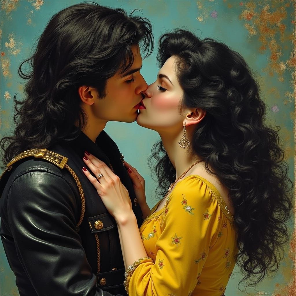 This image depicts a portrait of Hedy Lamarr in an art nouveau style. The artwork evokes the styles of several artists, blending classical and fantasy elements.