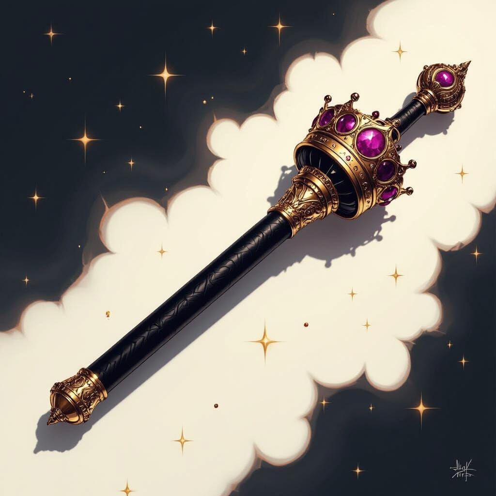 A striking picture of a luxurious black scepter topped with a vibrant purple crown. The image features realistic golden details, metallic textures, and dramatic lighting in a digital art style.