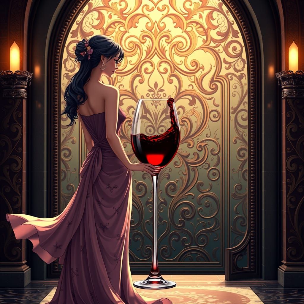 A captivating image of a woman in flowing robes before a crystal door. Anime-style details and vibrant aesthetics create a breathtaking, high-resolution scene with intricate textures.