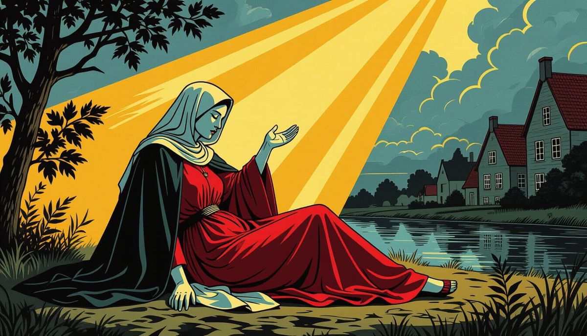 This image depicts the martyrdom of Saint Agatha in Belgium, created with bold outlines and flat colors reminiscent of ligne claire, featuring surreal elements and detailed realism.