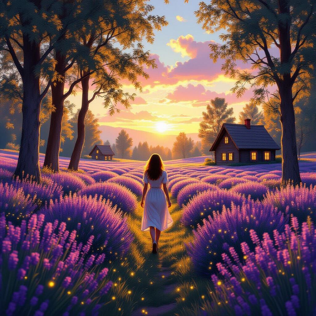 This image shows a woman walking through a lavender field at sunset. Fireflies glow in the pastel sky, and sunbeams filter through distant trees and cottages in a dreamy, magical cottagecore aesthetic.