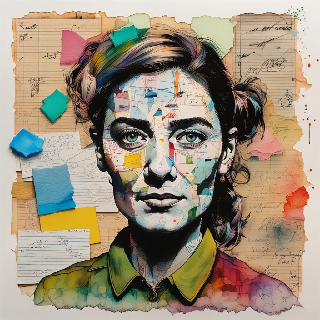 A vibrant mixed media collage portrait of a waitress. The artwork is highly detailed with triadic colors, and combines ink, pastel, stained plastic, and scribbled notes in an ultramaximalist style.