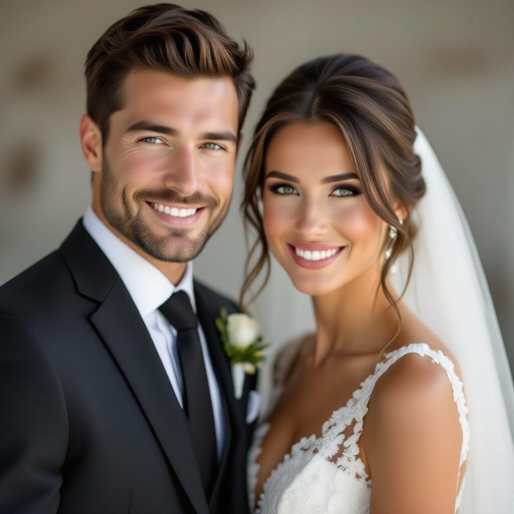 A professional, photorealistic close-up portrait of a husband in a suit and his wife in a white wedding dress, captured with studio lighting and sharp focus. Features a subtle bokeh effect.