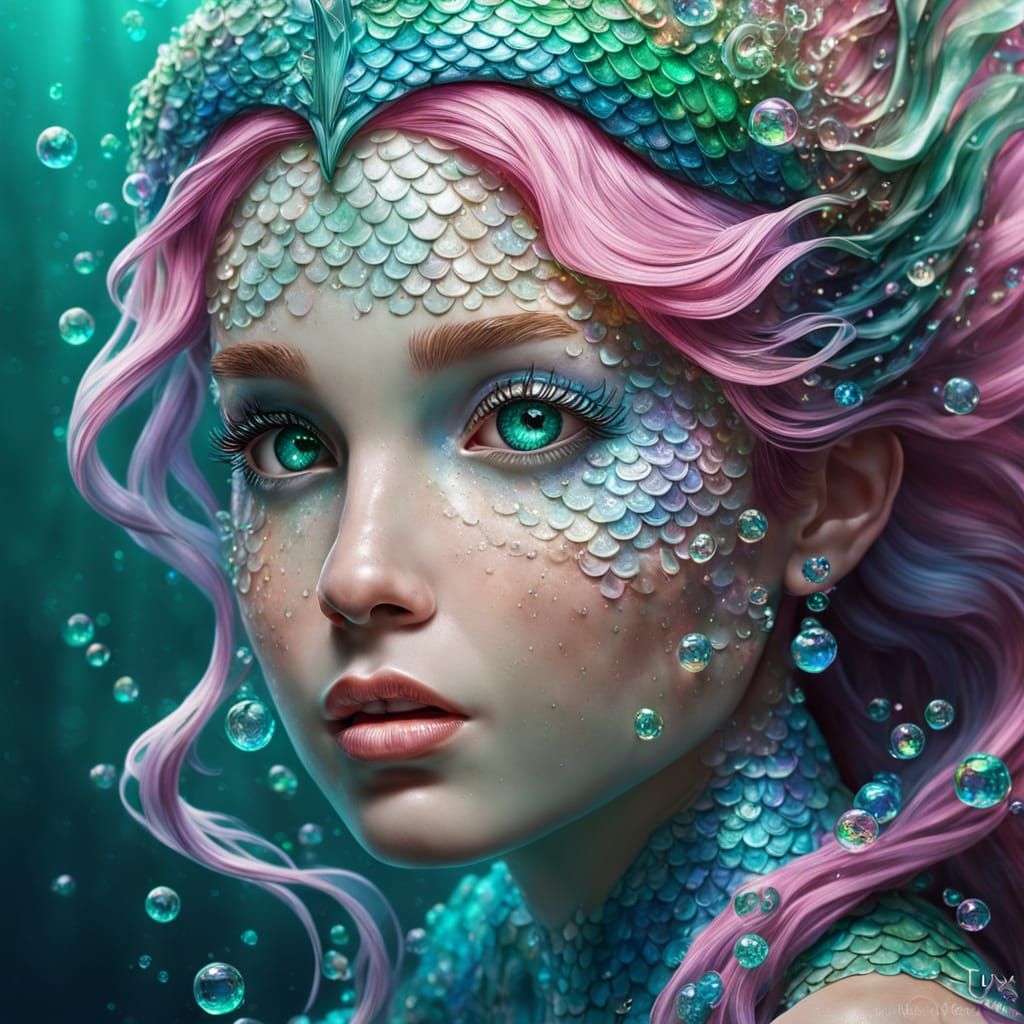 A hyperrealistic image of a mermaid swimming underwater. The mermaid's body is covered in scales and gills, and she has striking blue eyes. Bubbles surround her as she swims in luminous, vibrant colors.