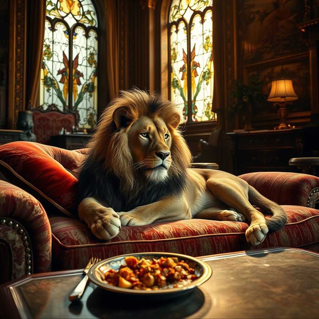 This image captures a regal lion lounging on a plush velvet cushion in a lavishly decorated Victorian parlor, surrounded by antique furniture and ornate tapestries, amidst soft, golden light.