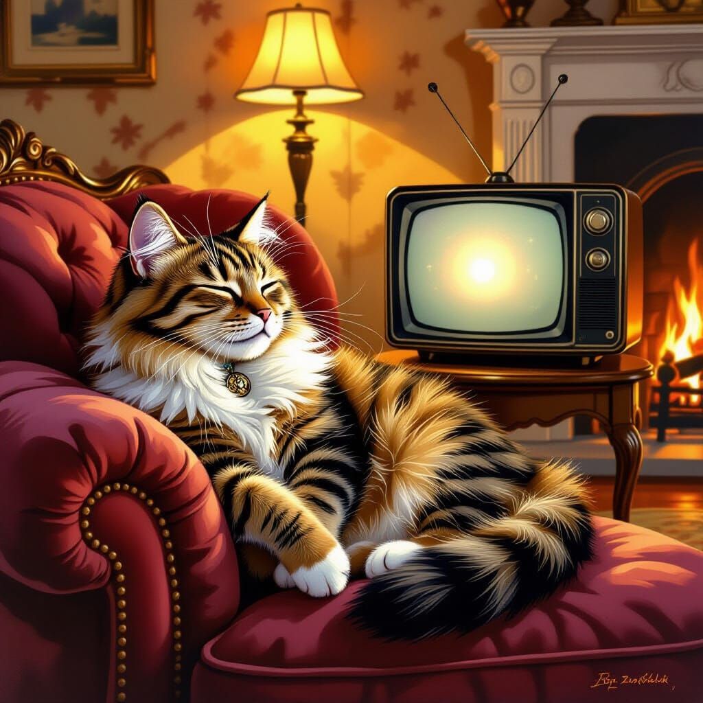 This image shows a tabby cat wearing a collar, asleep on a velvet sofa while watching TV. The scene is bathed in the warm glow of a fireplace, in a painterly style.