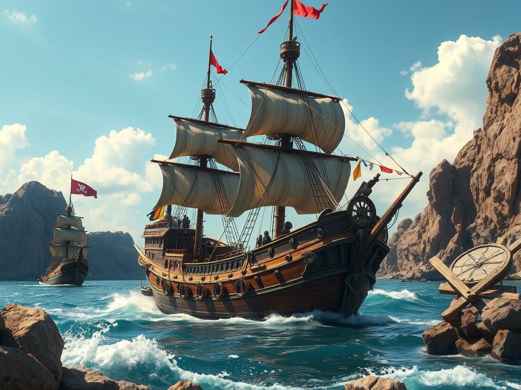 This image shows a gritty, colorful pirate ship sailing on a sunny day. The scene embodies an oceanpunk aesthetic with vibrant details.