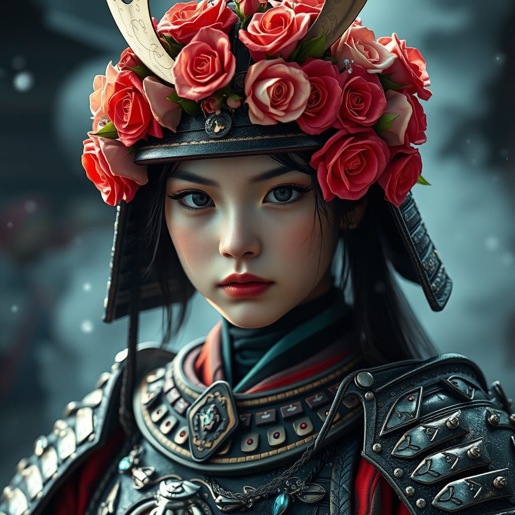 This image shows a Japanese samurai girl in ornate armor. The helmet is adorned with bright roses and sparkling crystals, captured in high-resolution with cinematic lighting, as digital art.