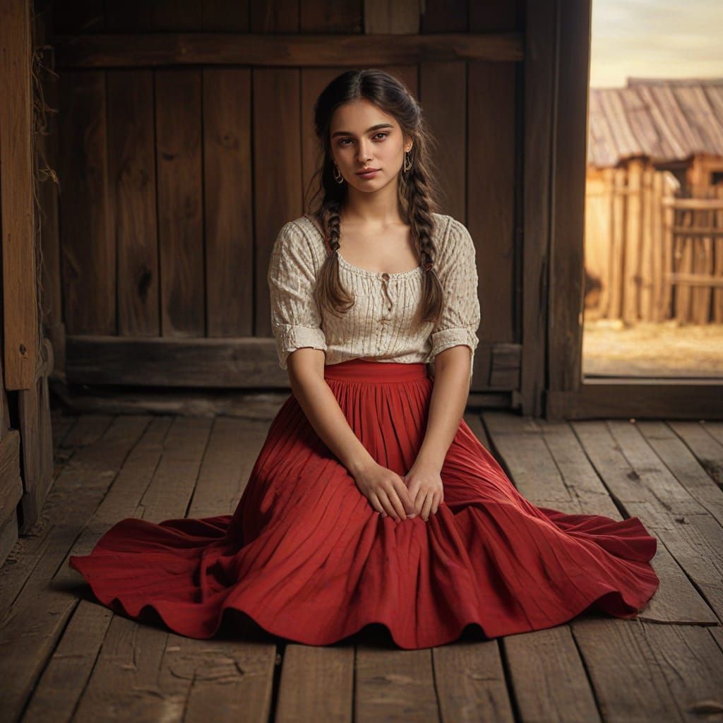 This image shows a young woman in a vibrant red skirt sitting on a barn floor. The portrait is rendered in a warm, rustic style reminiscent of folk art with expressive brushstrokes and earthy tones.