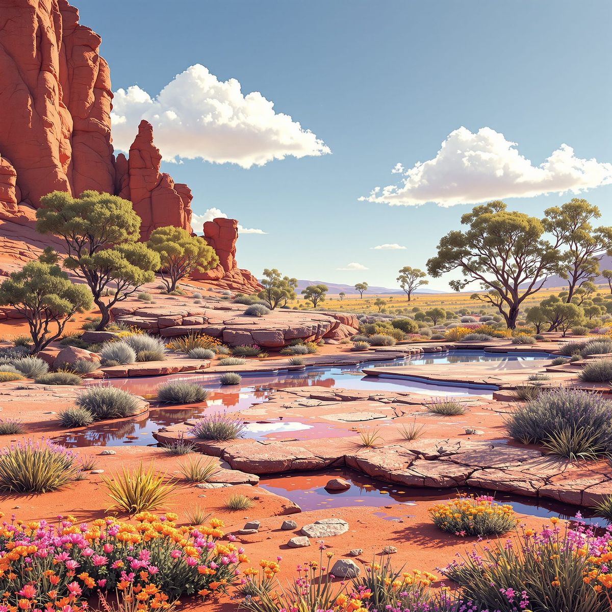 This photorealistic image showcases a beautiful Australian landscape bathed in sunlight, featuring vibrant wildflowers, orange-red earth, and eucalyptus trees, with an opalescent rock pool adding hints of blue and pink.