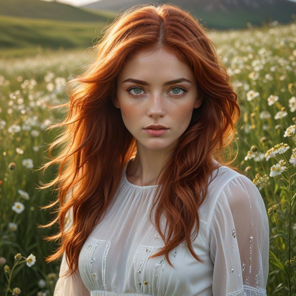 A hyperrealistic portrait of a red-haired, green-eyed young woman in a wildflower field. Soft, warm light illuminates the serene scene in this digital art piece.