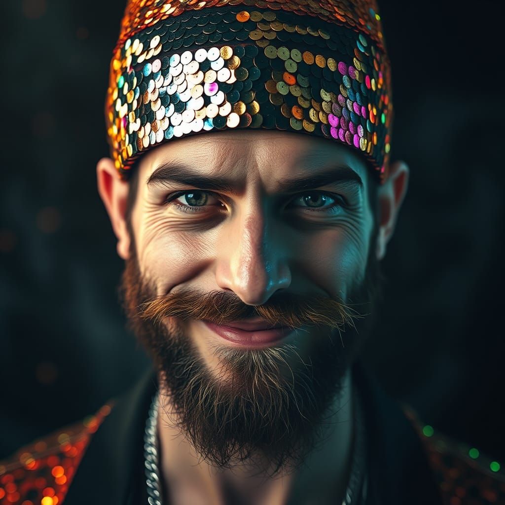 A striking picture of a bearded man smirking while wearing a fluorescent sequin hat. The macro shot emphasizes the textures, with a futuristic, avant-garde aesthetic reminiscent of bold, expressive art.
