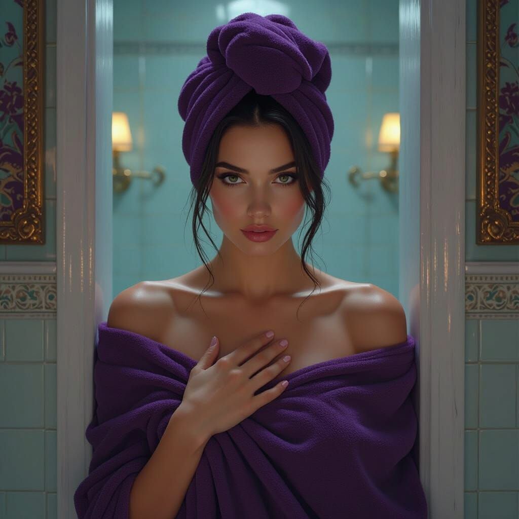 A woman emerges from a bathroom, wrapped in a dark purple towel. The image is rich with intricate details and deep colors, reminiscent of fantasy concept art and rendered in a detailed matte painting style.