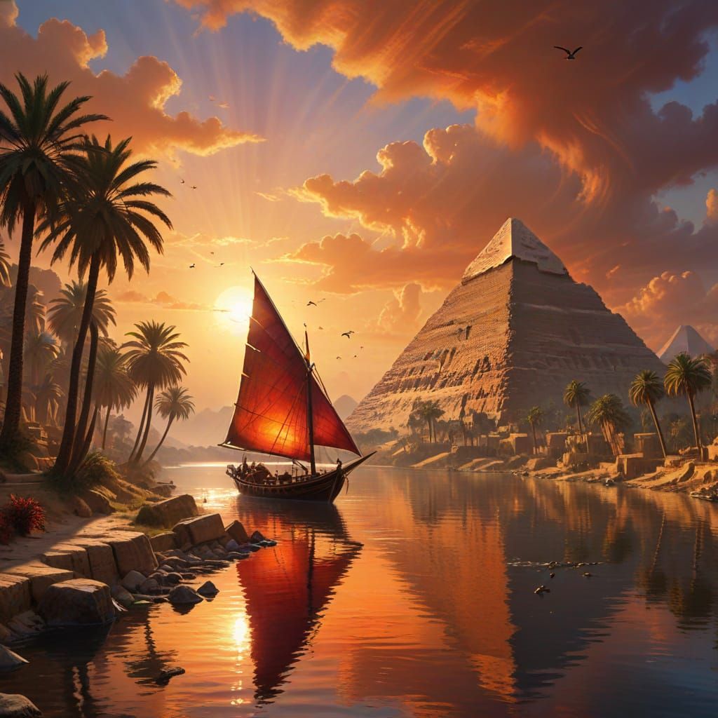 This image depicts a hyperdetailed, cinematic sunset over ancient Egypt. Pyramids and ruins line the Nile River, reflecting warm hues of orange and gold on the water as a sailboat glides by.