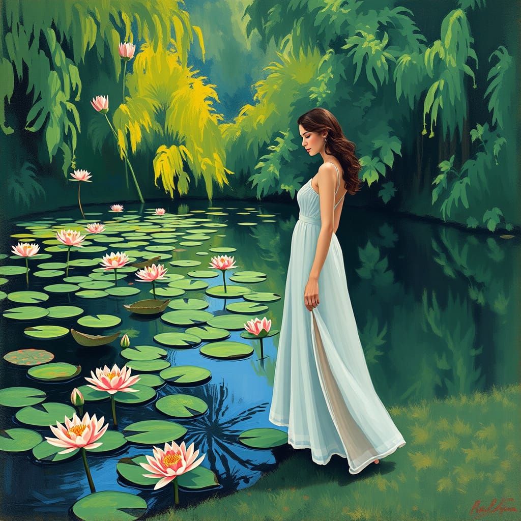 A vibrant painting of a woman in a flowing dress by a lily pond. The artwork is in the style of fauvism, featuring bold brushstrokes, flat forms, and expressive colors.