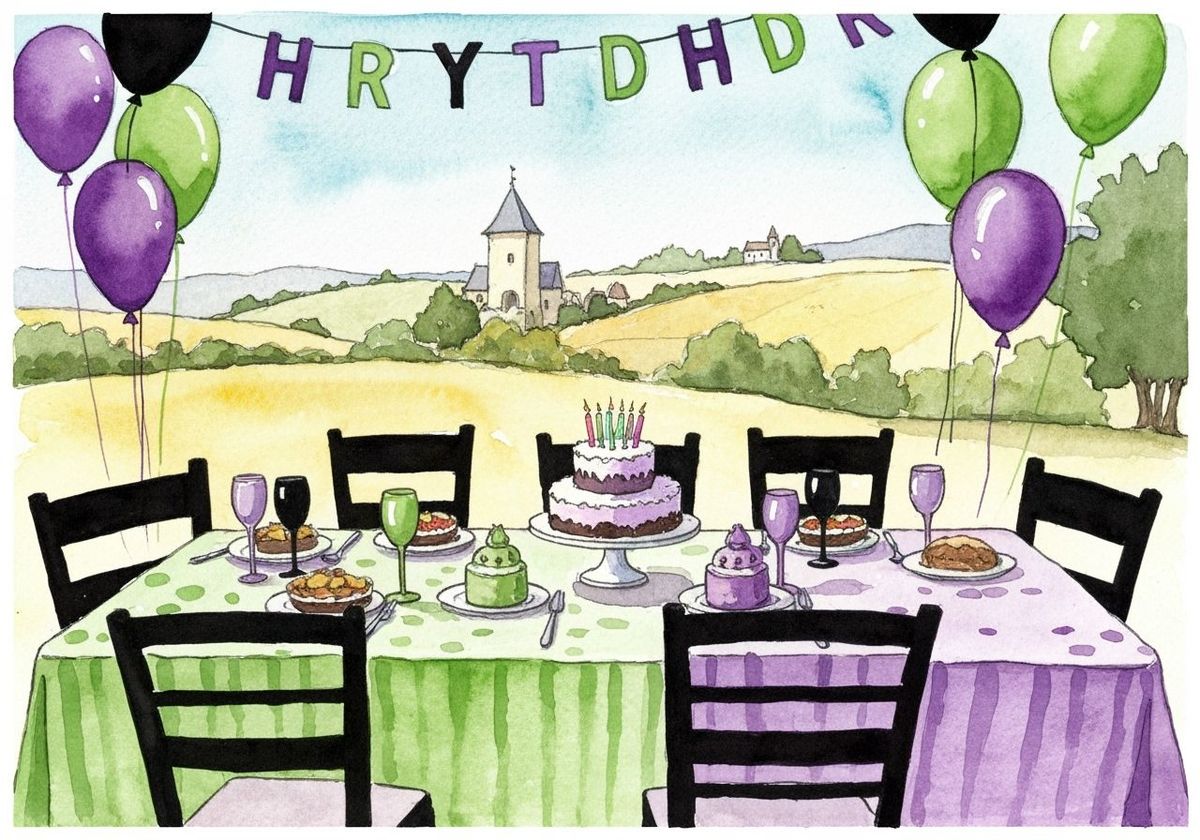 This image showcases a vibrant watercolor painting of a birthday party table laden with a cake, set against a charming French countryside backdrop in Périgord.