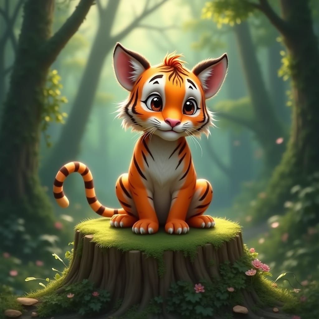 A vibrant tiger with big brown eyes sits on a mossy tree stump amidst lush foliage. The image is a detailed matte painting with rich colors and intricate details.