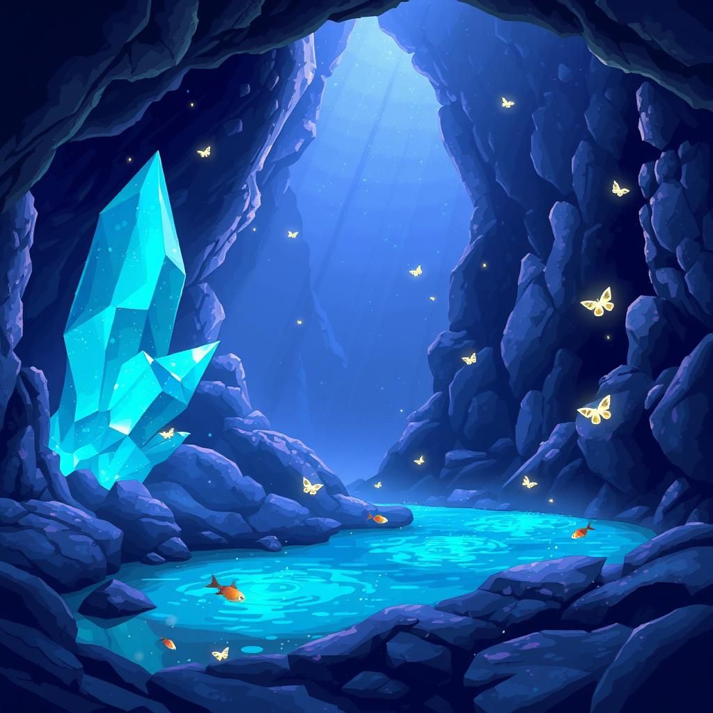 A striking picture of a cavern filled with giant crystals glowing in shades of blue, purple, and green. The scene is rendered in an 8-bit pixel art style.