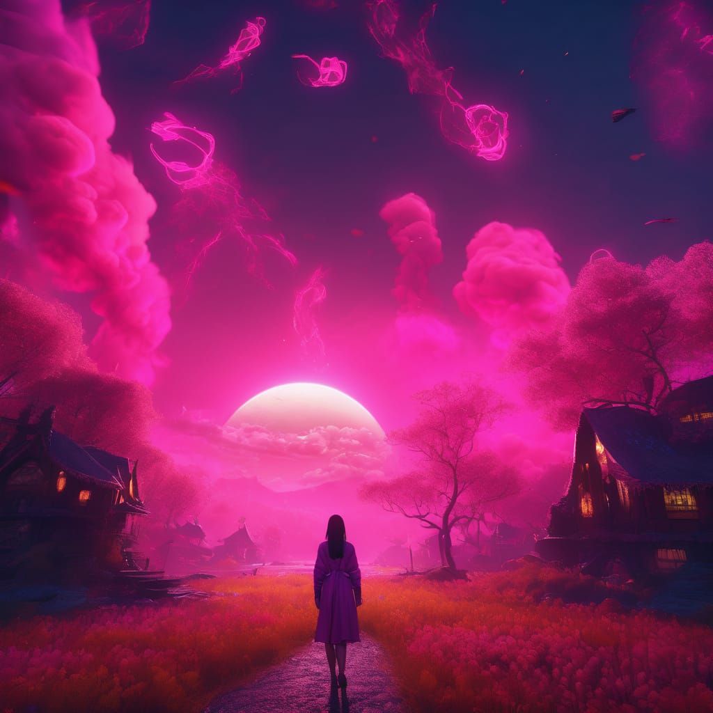 A mystical, dreamlike portrait of a teenage girl surrounded by swirling clouds of deep pink and black mist, with a subtle glow emanating from within, in a vibrant, hyper-realistic matte painting style.