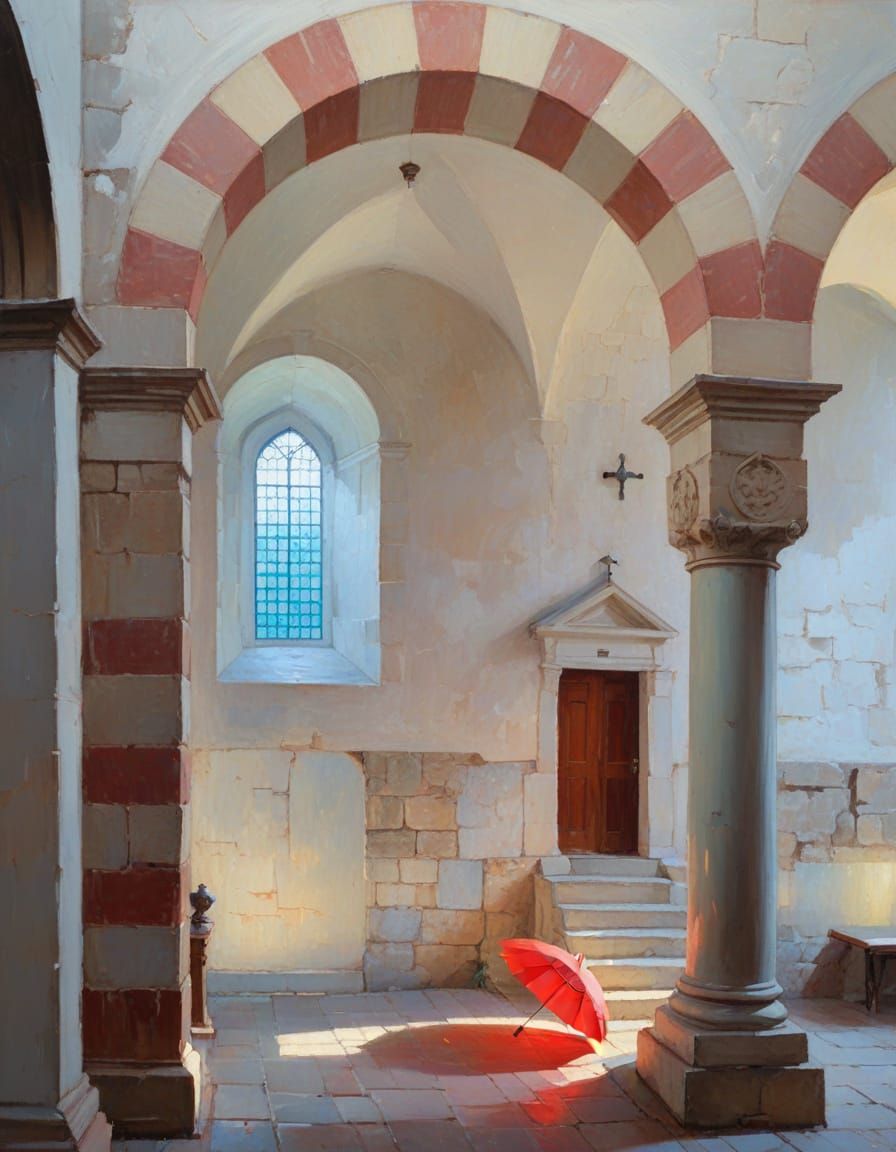 This image shows a woman with a red umbrella in a church. The scene is painted with soft brushstrokes and warm lighting, reminiscent of impressionist oil paintings.