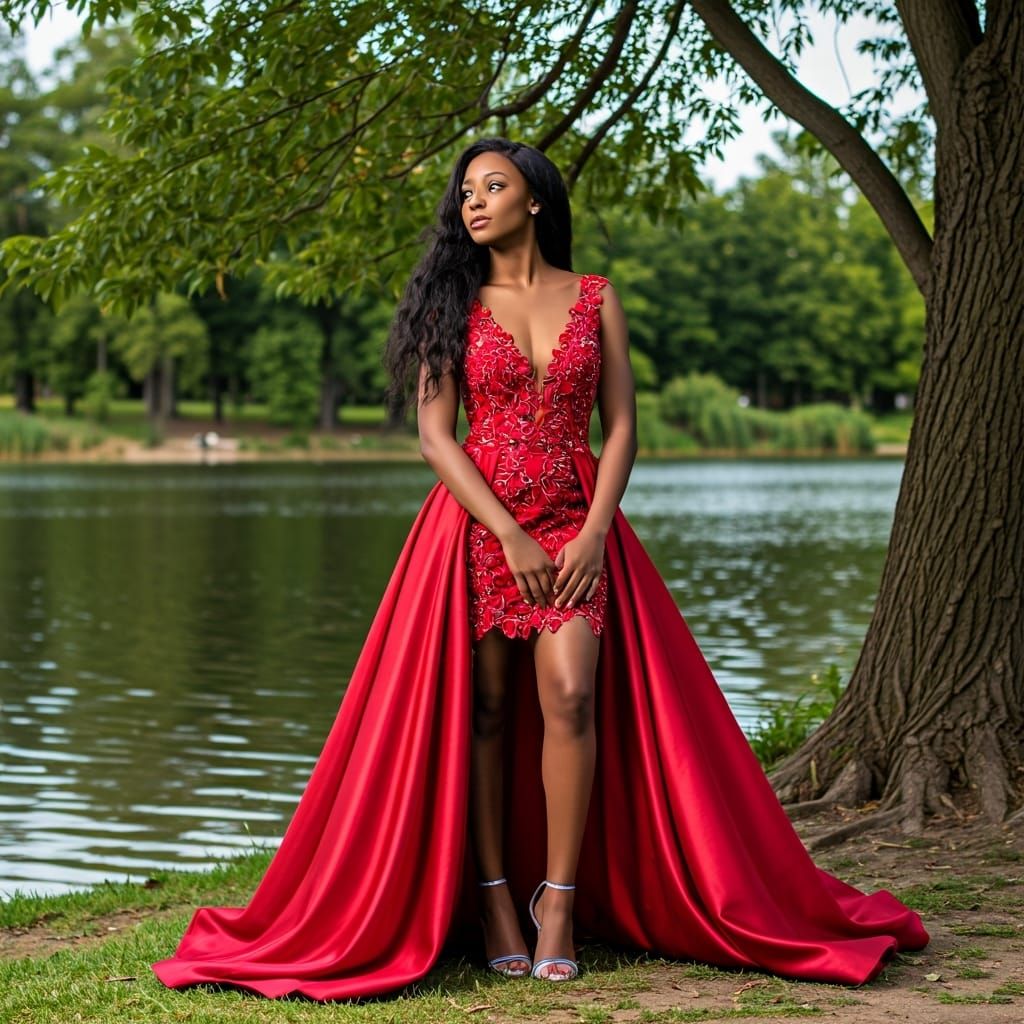 This image shows a Black woman in a red gown standing by a lake. The aesthetic evokes portraiture and landscape art with vibrant colors and serene settings.