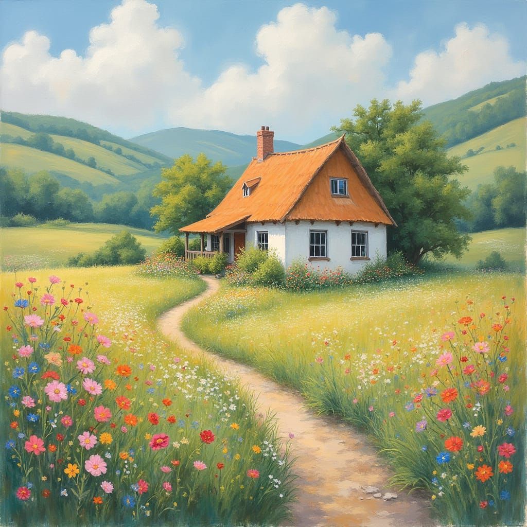 This image shows a charming cottage nestled among vibrant wildflowers in a serene rolling hills landscape, created in an impressionistic style with soft pastel colors and delicate brushstrokes