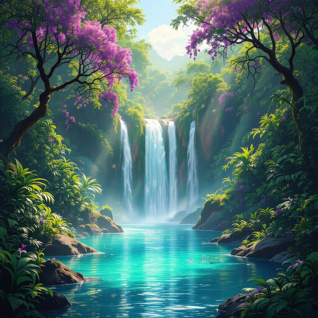 This image shows a vibrant jungle oasis with jewel-toned colors. A tall waterfall flows into a turquoise pool, with purple flowers and sunbeams enhancing the fantasy concept art style.