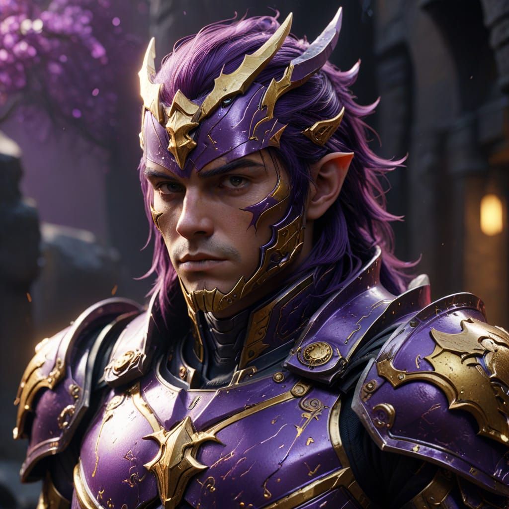 This image shows an anime character in a dark fantasy setting, depicted as hyperrealistic digital art. The subject wears intricately detailed armor, with vibrant purple and yellow hues under dramatic lighting.