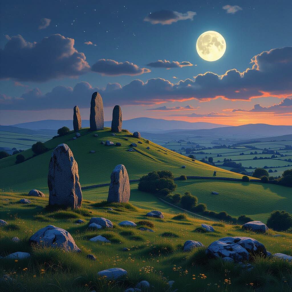 A concept art piece depicting rolling Irish hills under a moonlit night, featuring Celtic standing stones. The image uses dynamic lighting and vibrant orange and teal colors for a hyperdetailed look.