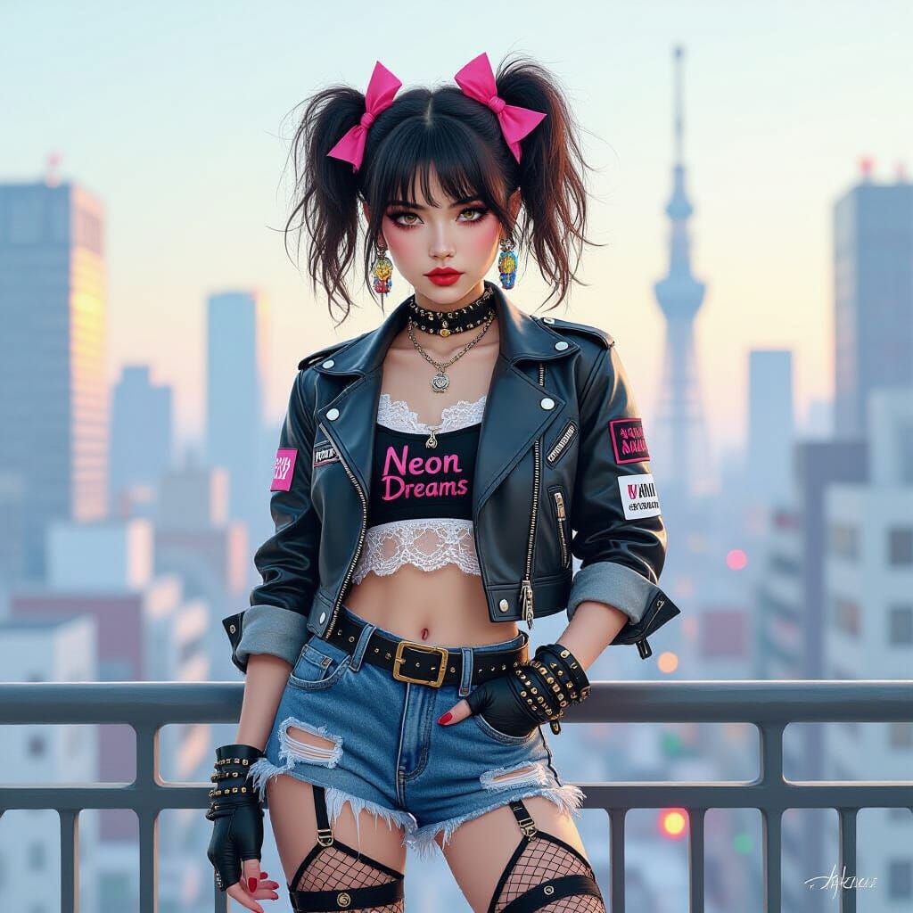 This image shows a punk rock Harajuku princess in layered lace and ripped fishnets, posed against a Tokyo cityscape. The artwork is reminiscent of vibrant color pencil art.