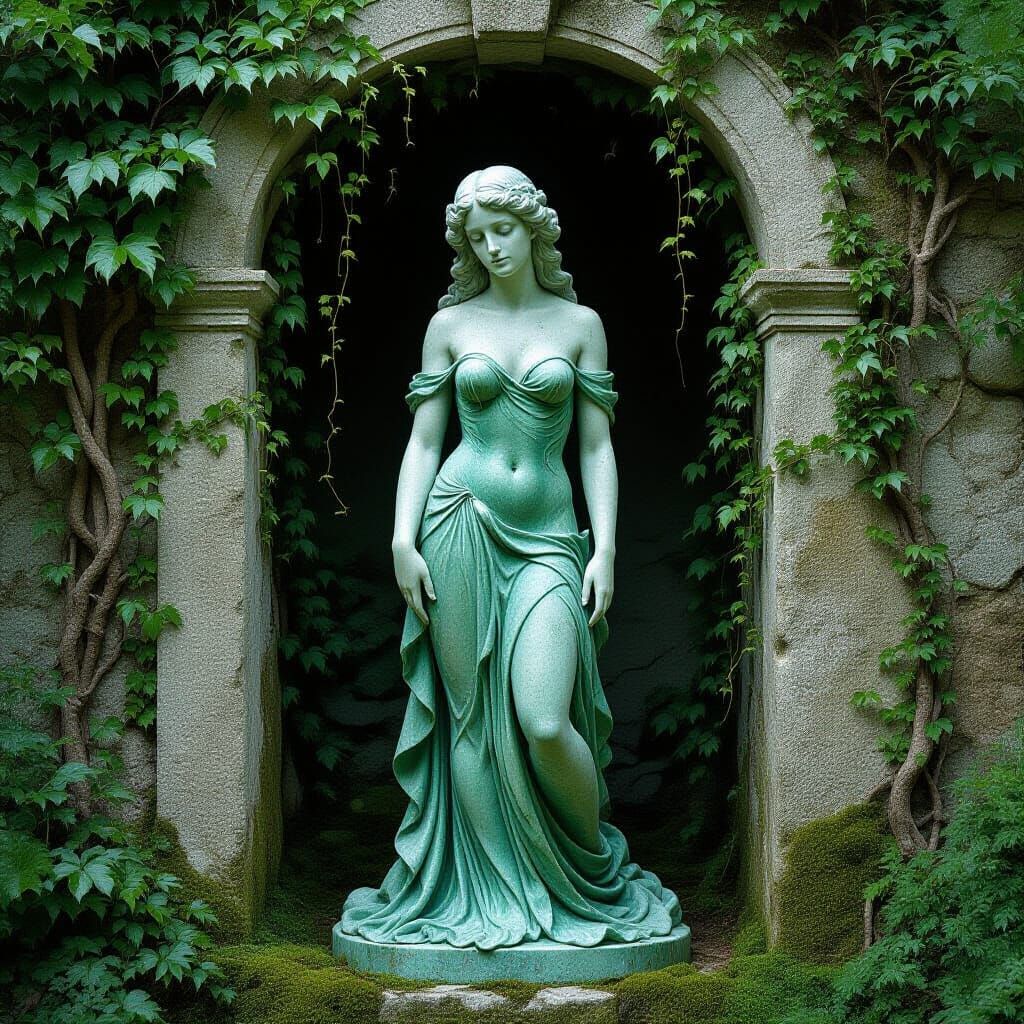 This image shows a sorrowful marble mermaid statue in a weedy grotto. The statue is draped in a flowing, seaweed-green gown, with intricate textures and a mystical, dreamlike quality, as surreal digital art.