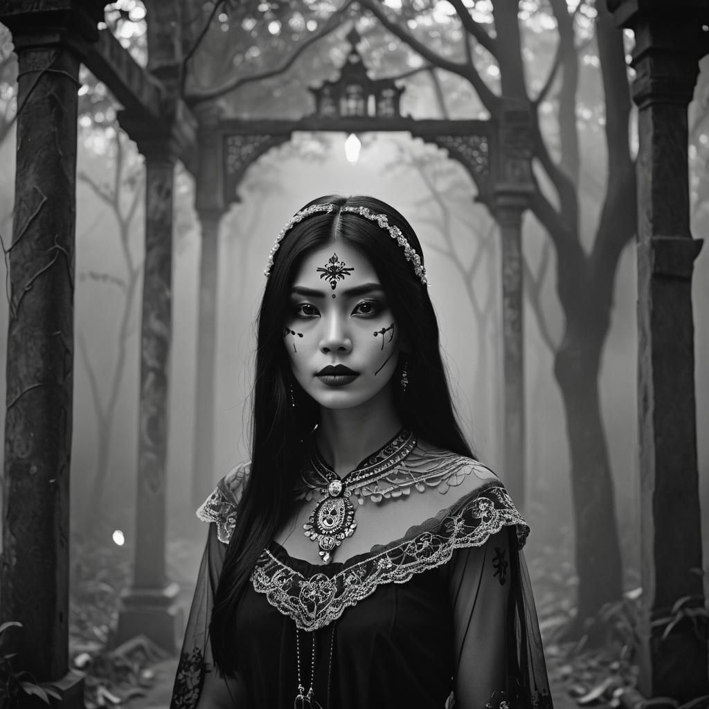 This image shows a stunning 20-year-old Thai woman in Catrina attire, set in a mystical scene. The black and white portrait features intricate makeup, detailed textures, and subtle film grain, rendered as realistic digital art.