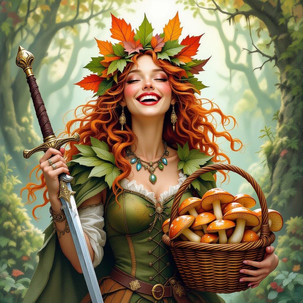This image shows a mushroom goddess with bronze hair, wearing a crown of leaves. She is laughing and carrying a basket of orange mushrooms and a sword, in a whimsical fantasy art style.