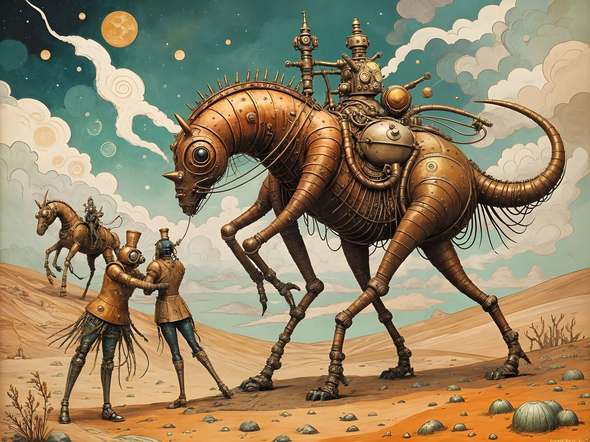 A steampunk robot Buddha on Mars, poised for battle. The bronze and copper robot has a steam-powered backpack. This graphic novel style image is reminiscent of classic comic art.