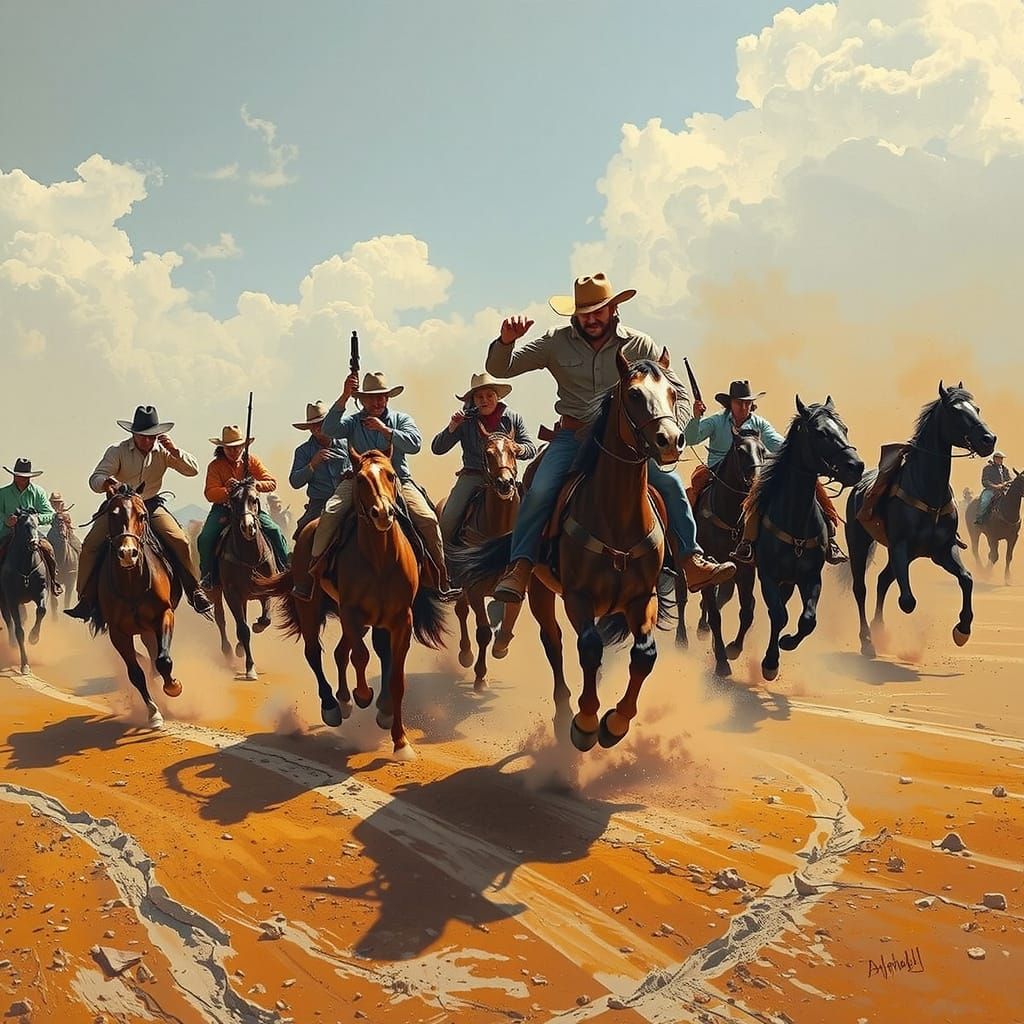 A dynamic scene of a fierce Wild West battle, depicting cowboys in intense combat with firearms. The artwork captures dramatic lighting and chaotic movement in a dusty, sun-baked environment.
