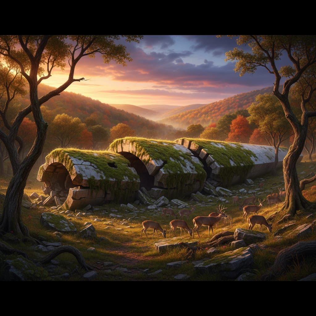 This hyperrealistic image shows the toppled Washington Monument overgrown with moss and grass after 500 years. Deer graze nearby in a vibrant, detailed forest setting.