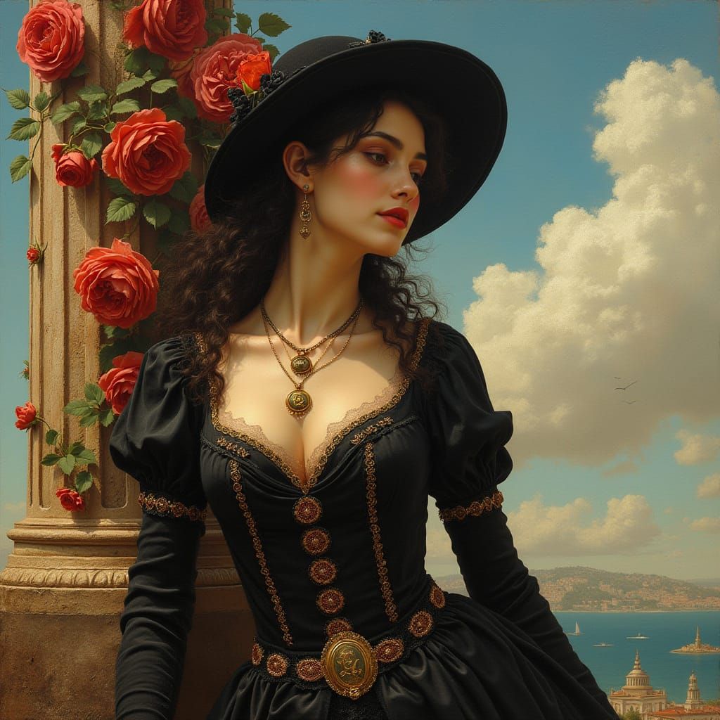 Ao pé da torre coberta por rosas vermelhas, ela surgia como uma lenda renascida. Os cabelos negros como breu dançavam ao vento, contrastando com o dourado vibrante de seu vestido. Na cintura, preso por um fino cinto de renda, um medalhão oval trazia a inscrição "BG", brilhando como sol de verão. A arquitetura ...