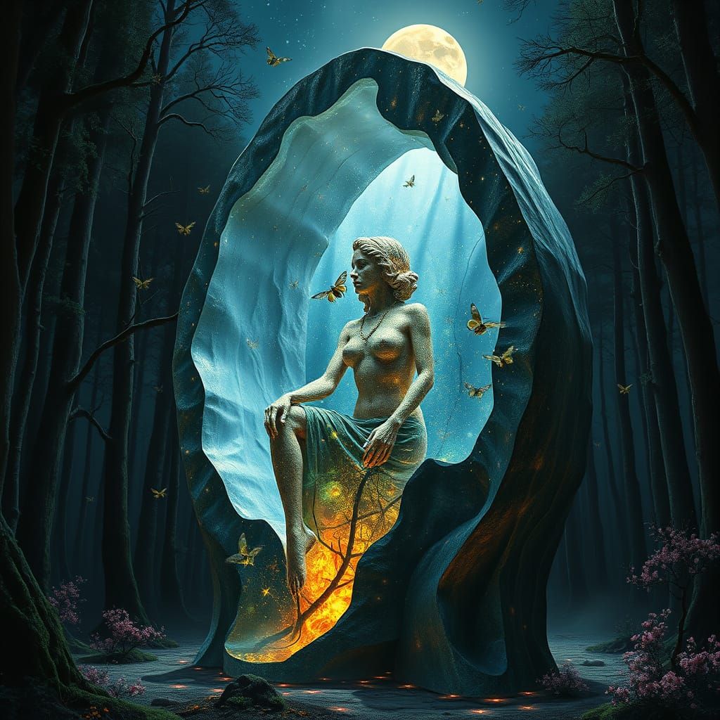 This image depicts a 1970s female sculptor within her massive abstract artwork. It features mystical shamanic elements, bio-art collage style, and a luminous, dreamlike landscape.